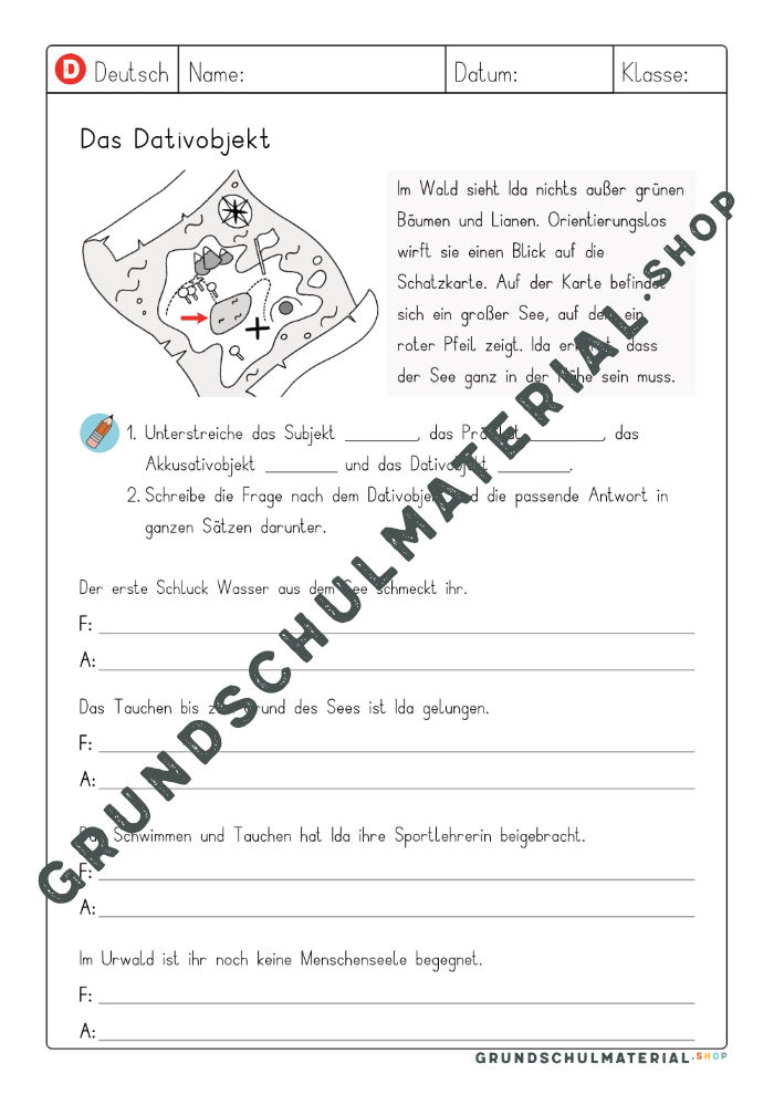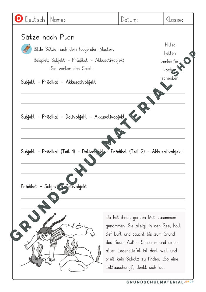- Einführung der Satzglieder Subjekt, Prädikat, Akkusativobjekt, Dativobjekt, Genitivobjekt, Zeitangabe und Ortsangabe