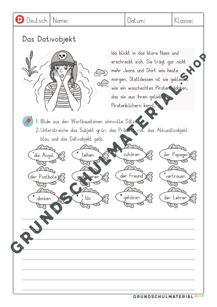 Mithilfe einer altersgerechten Geschichte werden die Kinder Blatt für Blatt durch die Aufgaben geführt. Eine kreative Gestaltung fördert zudem den Spaß am Lernen und weckt die Neugier der Kinder. Einige Übungen verlangen das Unterstreichen oder Einkreisen der bestimmten Satzglieder. Durch die Verwendung von Buntstiften, um die Satzglieder farblich zuzuordnen, prägen sich die Grundschüler diese visuell ein. Ziel ist es, dass sie die Wortgruppen nach diesem Materialpaket selbstständig erkennen und bestimmen.
